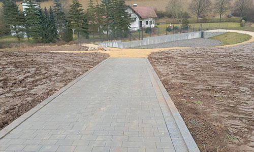 Im Rahmen der Erdarbeiten werden etwa 4.500 m³ Oberboden abgetragen und der Boden für den weiteren Bau vorbereitet. Für den Straßenbau wird eine Schottertragschicht mit einer Fläche von rund 3.500 m² hergestellt, und auf dieser werden Asphaltdecken von insgesamt etwa 1.700 m² verlegt. Zusätzlich wird eine Entwässerungslösung eingebaut, die Sickerleitungen mit einer Länge von ca. 350 m sowie Straßenabläufe und Schächte umfasst. Die Pflasterarbeiten beinhalten das Verlegen von Beton- und Natursteinpflaster auf ca. 600 m².